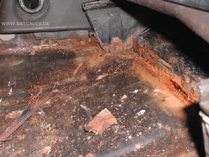 Ach ja, die Innenausstattung hat unter der undichten Frontscheibe zu leiden gehabt: Komplett stockig. Bei näherer Betrachtung fallen ein paar Stellen an der Karosserie auf...