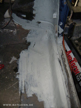 Die Arbeiten gingen sogar bei Winterwetter weiter. Treffen zur Schwellerwiederherstellung links: "Du, da ist ein Wassertropfen in Deinem Auto" "Ja, Und?" "Der lässt sich ohne Verformung hin- und herschieben. Ich glaube, dem ist so kalt, dass er eingefroren ist..." Trotz eigenwilliger Witterung der Beweis: Hier schweißt der Meister noch persönlich!