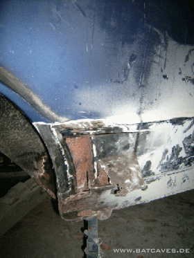 Mal sehen, was als nächstes kommt... ...und es wird kommen: Nur mal kurz etwas Spachtel vor dem hinteren rechten Radlauf weggeschliffen um sicher zu gehen, dass die Ecke in Ordnung ist, und: lecker Gammel im Bereich Schweller/Radlauf und eingeschweißter ehemaliger hinterer Tür. Na sauber, und ich dachte schon, wir wären fast fertig....