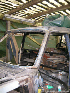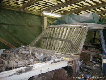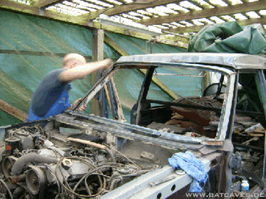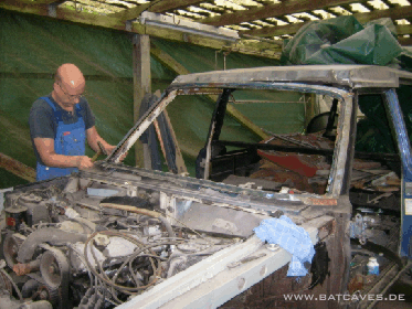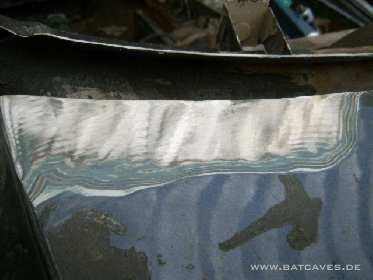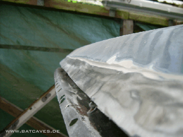 So, diesen Sommer ist dann doch noch was passiert: Die Endspitze links ist fertiggeworden, die Löcher am obern Rand der rechten Sargraumscheibe sind zu und - das Highlight: Der Windschutzscheibenrahmen!!! Nach anfänglichem Optimismus ließ die Euphorie beim heraustrennen der erforderlichen Blechhaut aus dem großzügig zurechtgeflexten Schlachtauto-Scheibenrahmen stark nach: 1000 Schweißpunkte aufbohren und vor allem an den A-Säulen ein umgefalztes Blech, was ausser als Rostquelle und Schweisspunkt-Aufbohrverhinderer wohl keine sinnvolle Eigenschaft hat... Doch auch das Problem wurde mit hartnäckiger Bohrerei gelöst und der nach vielen Stunden endlich isolierte Rahmen erst mal probehalber auf dem Wagen mit Grippzangen fixiert. Vorher natürlich erst mal dem Rahmen schön blank machen... Hier noch einmal die Vielzahl der Lack- und Spachtelschichten und die Dachoberkante mit ihrer niedlichen kleinen Spachtelschicht (Die Bohrlöcher haben einen Durchmesser von 8 mm, zur Orientierung)